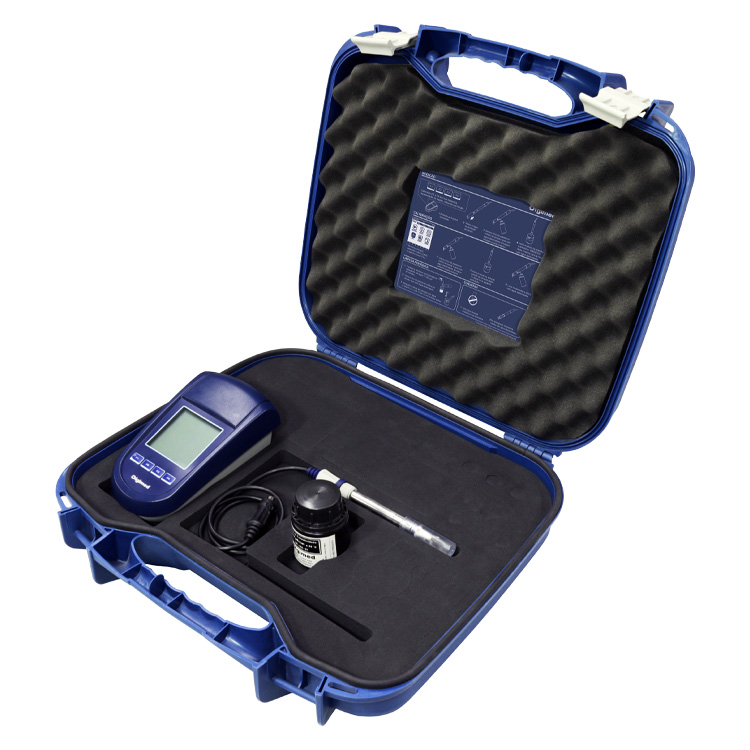 - Parte eletrônicos alojada em uma caixa de alumínio fundido resistente revestida com tinta resistente a solventes equipada com uma sonda de aço inoxidável destacável;